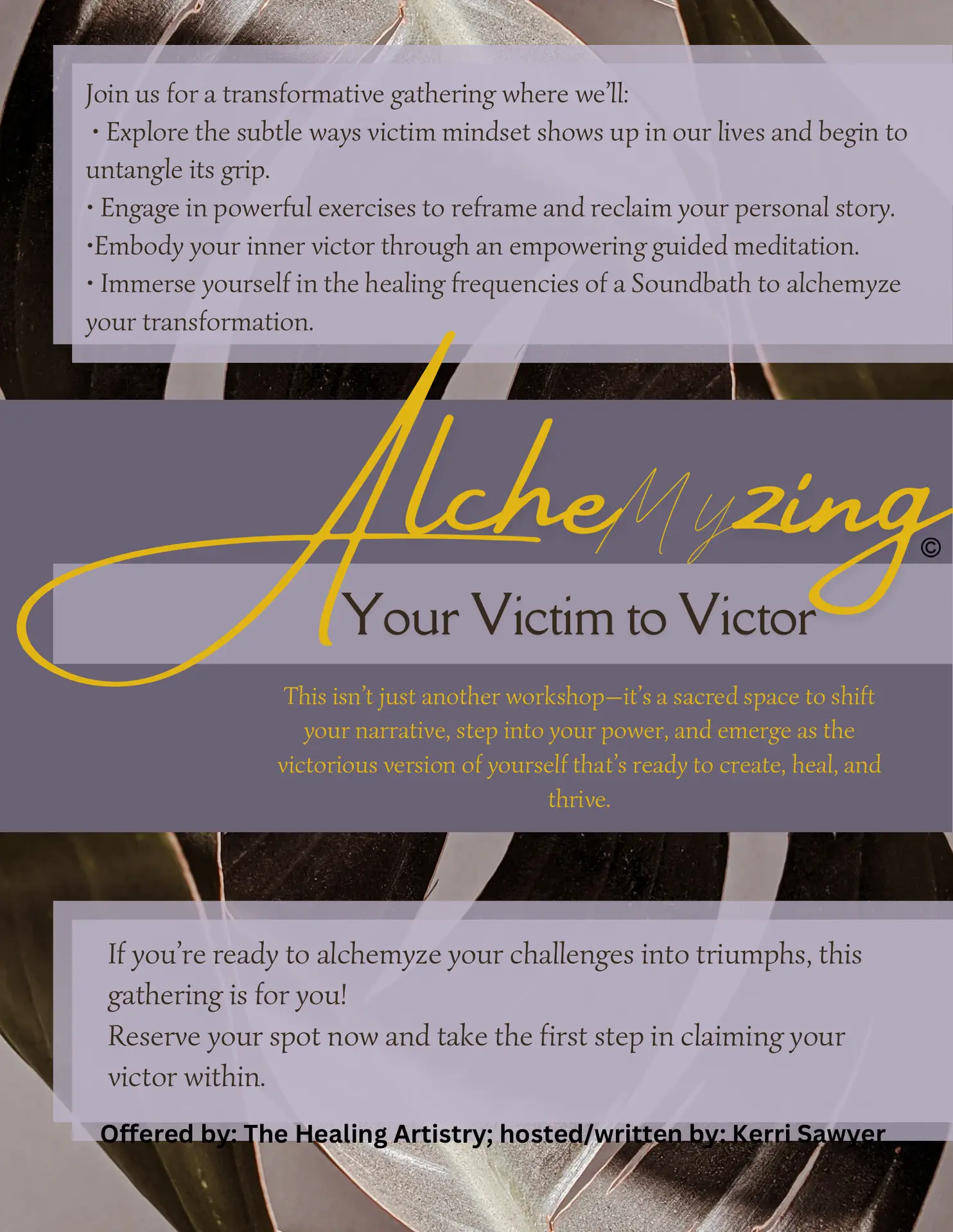 Have you ever felt stuck in patterns of blame, frustration, or powerlessness? The victim mindset can sneak into our lives, often masked as doubt, fear, or self-criticism. It’s the voice that says, “This always happens to me,” or “I’ll never get past this.” While it’s natural to feel this way at times, living in this mindset keeps us tethered to the past, drains our energy, and blocks us from the fullness of our potential. But what if you could alchemize those feelings into strength, purpose, and victory? Join us for a transformative gathering where we’ll: • Explore how the victim mindset shows up in our lives and begin to untangle its grip. • Engage in powerful exercises to reframe and reclaim your personal story. • Embody your inner victor through an empowering guided meditation. • Immerse yourself in the healing frequencies of a Soundbath to anchor your transformation. This isn’t just another workshop—it’s a sacred space to shift your narrative, step into your power, and emerge as the victorious version of yourself that’s ready to create, heal, and thrive.